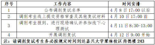 硕士研究生复试将采取现场复试方式进行,调剂复试安排初定如下,如有变更另行通知: