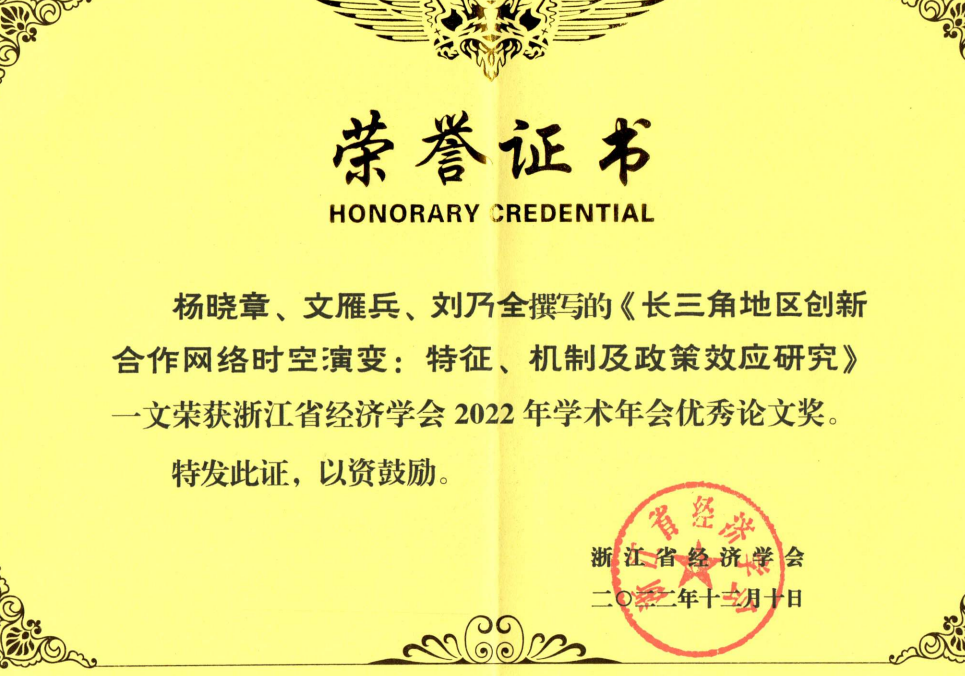 本次学术年会共征集近百篇高质量论文,其中48篇论文入选线上分论坛交流。经本届年会组委会专家严格评审,麻豆tv 杨晓章博士递交的学术论文《长三角地区创新合作网络时空演变:特征、机制及政策效应研究》荣获浙江省经济学会2022年学术年会优秀论文奖。