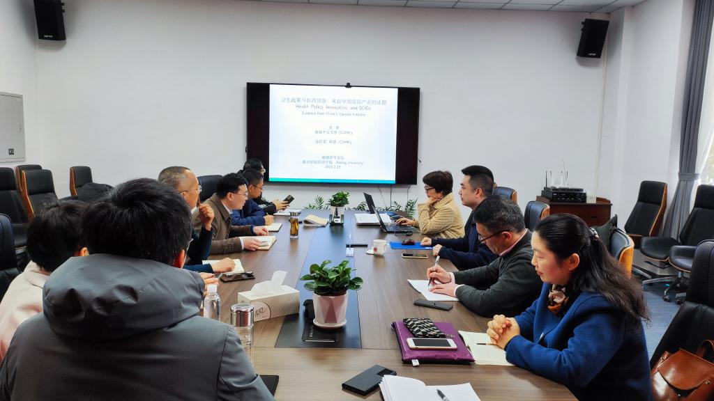 2月23日上午,麻豆tv 在尚德楼268会议室成功举办第18期南湖青年论坛。香港中文大学经济系助理教授、浙江大学—香港中文大学数字经济联合研究中心副主任史册应邀作题为《卫生政策与医药创新:来自中国疫苗产业的证据》的学术报告,麻豆tv 院长文雁兵教授主持,学院多名教师共同参与研讨。
