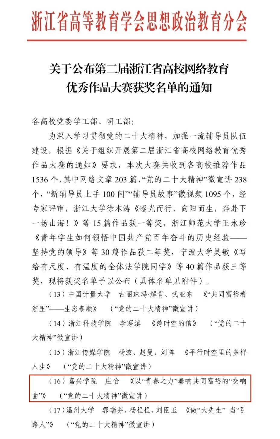 近日,浙江省高等教育学会思想政治教育分会公布了第二届浙江省高校网络教育优秀作品大赛获奖名单,麻豆tv 辅导员庄怡提交的“党的二十大精神”微宣讲作品《以“青春之力”奏响共同富裕的交响曲》荣获二等奖。