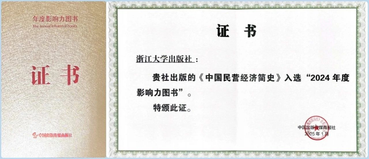 日前,《中国出版传媒商报》发布了2024年度影响力书单,延续一贯的宗旨和分类,参考各大新书排行榜,经过多轮筛选而成,从7个不同领域甄选出了149种图书。由史晋川教授、文雁兵教授牵头研究和领衔出版的《中国民营经济简史》入选“2024年度影响力图书” 。