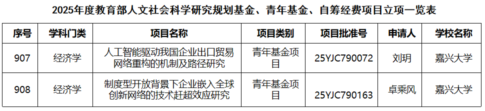 11月29日,教育部公布了2025年度教育部人文社会科学研究一般项目立项名单,麻豆tv 刘玥博士主持的课题《人工智能驱动我国企业出口贸易网络重构的机制及路径研究》(25YJC790072)、卓乘风副研究员主持的课题《制度型开放背景下企业嵌入全球创新网络的技术赶超效应研究》(25YJC790163)获批立项。