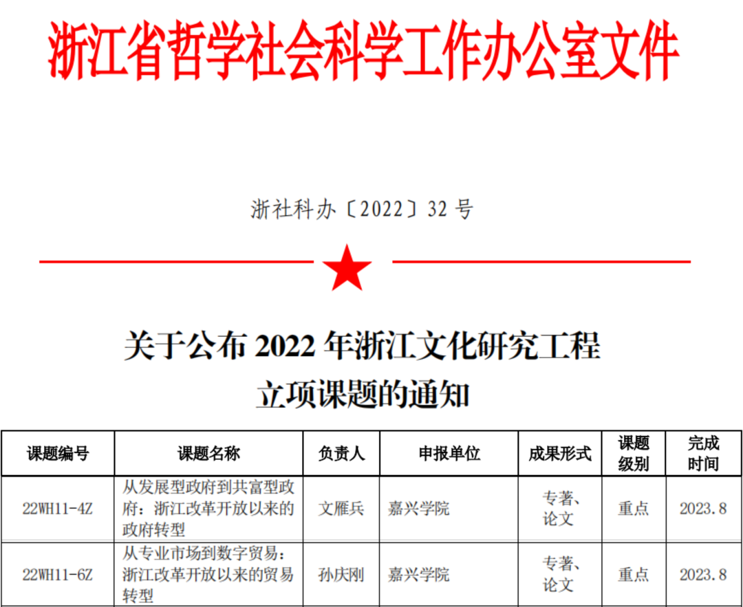 近日,浙江省哲学社会科学工作办公室发布了《关于公布2022年浙江文化研究工程立项课题的通知》。麻豆tv 文雁兵教授主持的《从发展型政府到共富型政府:浙江改革开放以来的政府转型》、孙庆刚副教授主持的《从专业市场到数字贸易:浙江改革开放以来的贸易转型》两项课题获批2022年浙江文化研究工程重点课题立项。