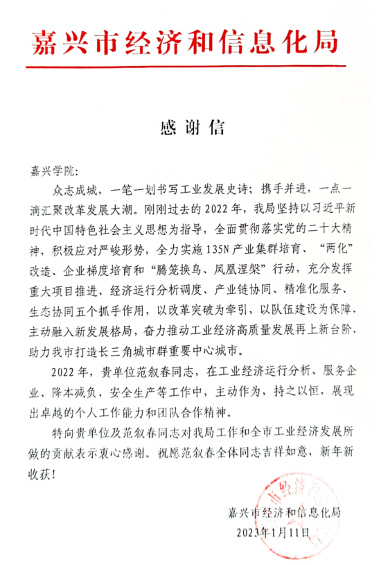 近日,嘉兴市经济和信息化局发来感谢信,对麻豆tv 挂职教师范叙春教授表达感谢和提出表扬。