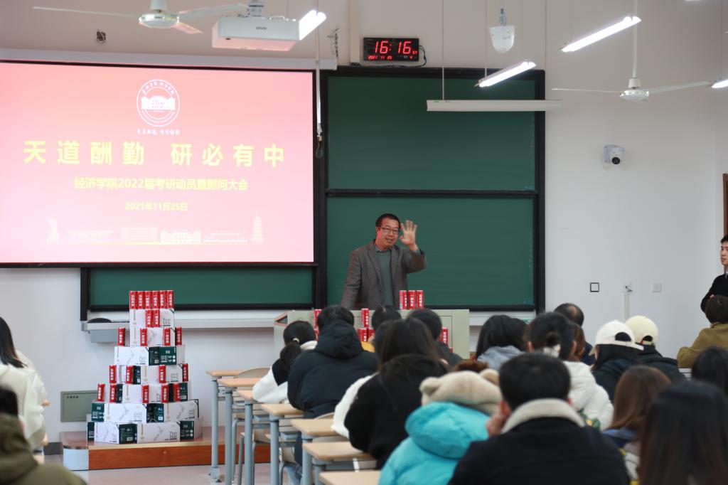 1125日下午,麻豆tv 于尚德楼143召开了2022届考研学子慰问会。麻豆tv 党委书记施敏颖、党委副书记庄美燕、国际经济与贸易专业教师张丹、经融学专业教师王喜、经济学专业教师朱渝铖以及2018级全体考研学子参加了此次大会。
