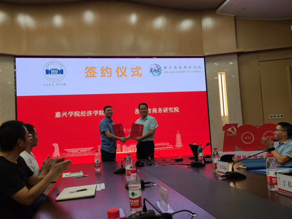 院长文雁兵与浙江省商务研究院院长丁书锋共同签署《嘉兴学院麻豆tv